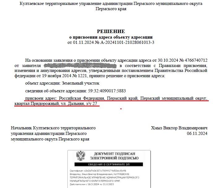 Официальный адрес: Пермский край, муниципальный округ Пермский, квартал Придорожный, улица Дальняя, з/у 27. Кадастровый номер: 59:32:4090017:5883